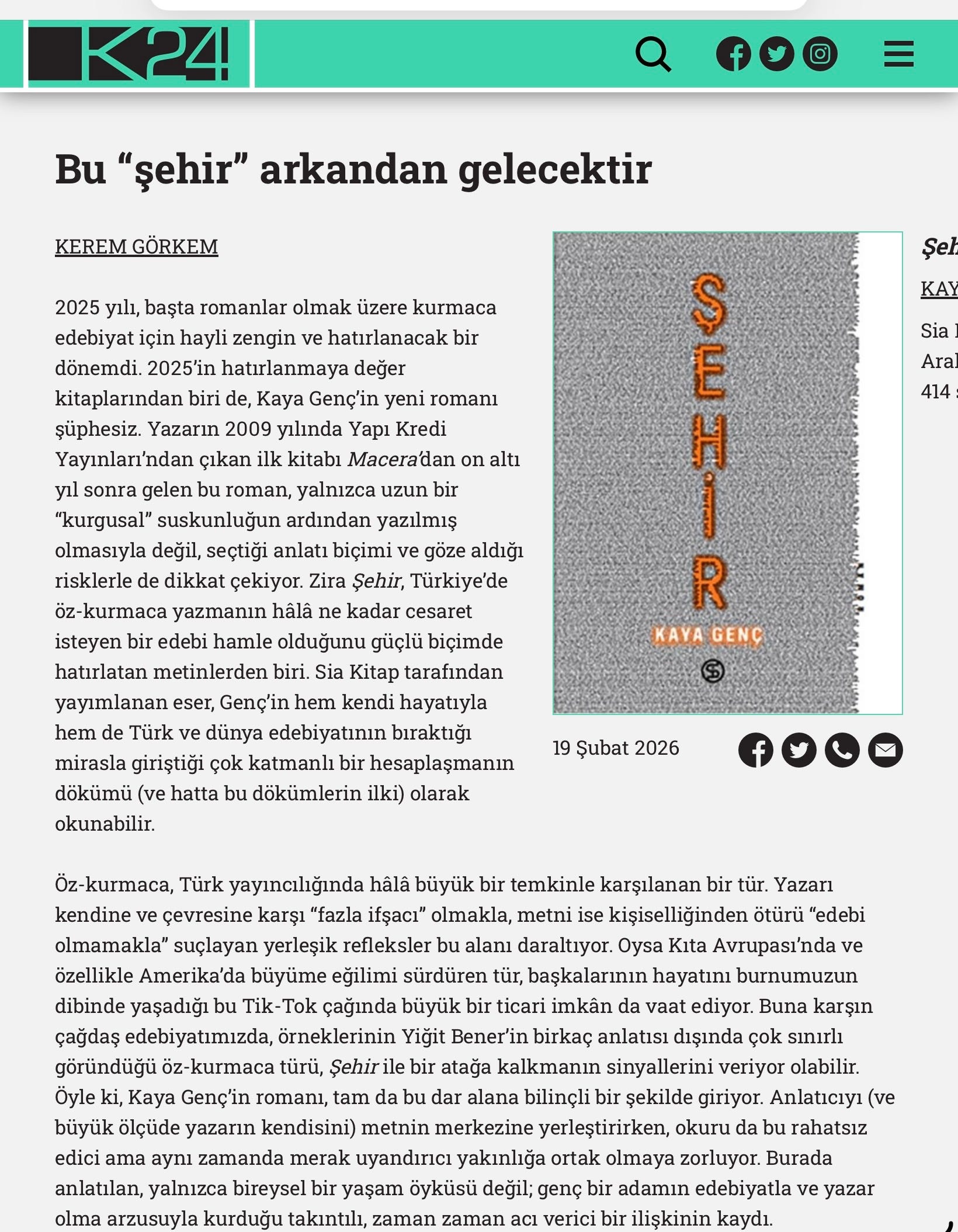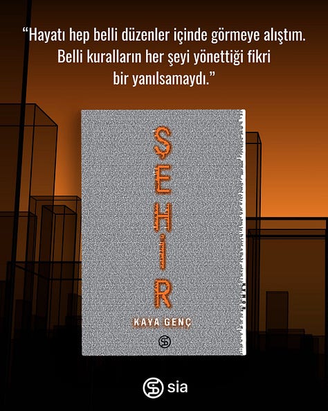 “In our contemporary literature, the autofiction genre has had a limited reach… but Şehir may be signalling its rise… Kaya Genç’s new novel strongly reveals how fragile and risky writing autofiction in Turkey is even today. This brave work perhaps paves the way for dozens of other autofictions in the future... This novel, which comes after a sixteen-year wait after his debut, is the product of Kaya Genç’s patient and persistent relationship with literature.”